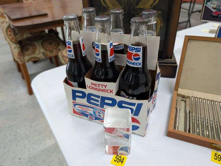 LOT 594 - Lot of 6 Richard Petty Pepsi bottles and Dale Earnhardt Jr Paperweight