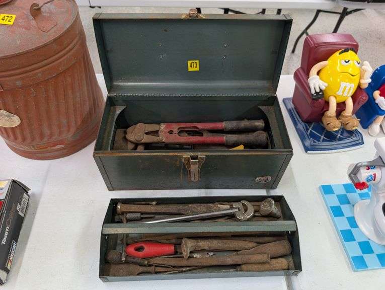 LOT 473 - vintage metal toolbox with miscellaneous tools included