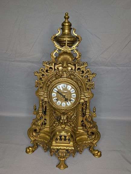 Marked "Imperial on the face. Brass construction with enamel numerals on the face. Includes key. Inside mechanism is marked "Germany" and includes other markings which are obstructed by parts. Note pictures carefully. Measures 25" tall, 14" wide and 7" deep. Weighs 23lbs.
